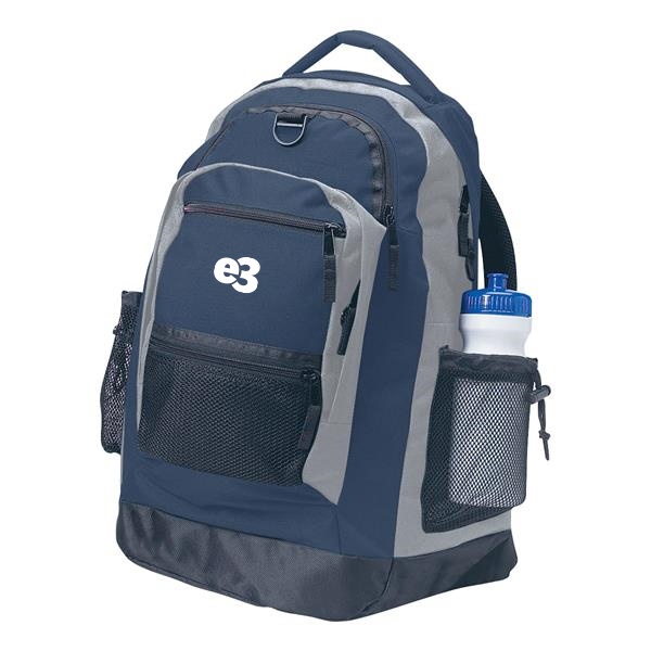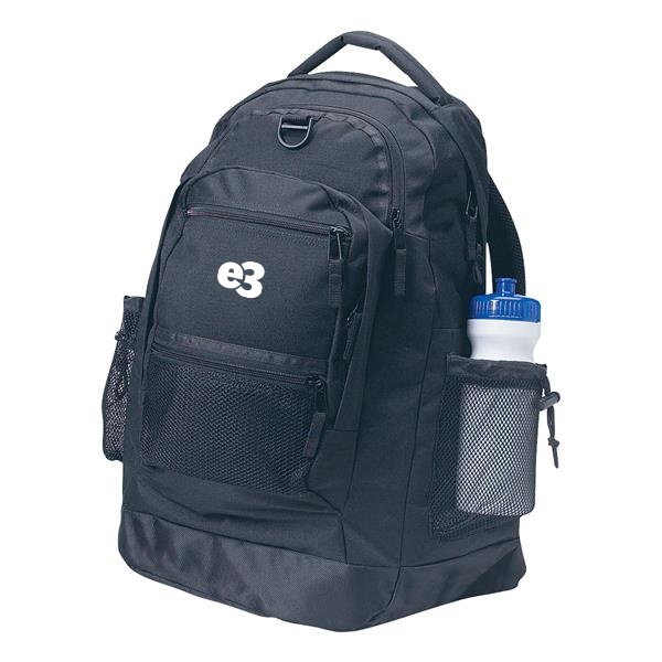 This sports backpack will help carry your marketing efforts to new heights! Measuring 15 1/2″ x 20″ x 7″, this versatile piece of luggage is made from 600-denier nylon with ballistic vinyl bottom support. It features a main zippered compartment with a padded back, a front organizer compartment with two outside pockets, a mesh zippered pocket and two drawstring mesh side pockets for bottles or phones. It is padded with foam rubber, has mesh-lined adjustable shoulder straps, sport zipper pulls. It should be spot cleaned and air dried.